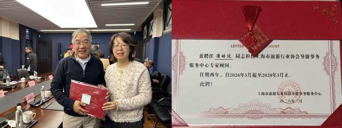 此次座谈会的成功举办,不仅为导游培训和服务质量提升提供了新的思路和方向,也为我院在相关领域的研究和实践提供了重要的参考和借鉴。同时本次座谈会后潘皓波院长由上海市文旅局副处长潘莉正式颁发专家顾问聘任证书。未来,数字文旅学院将继续加强与行业内的交流与合作,共同推动旅游业的高质量发展。